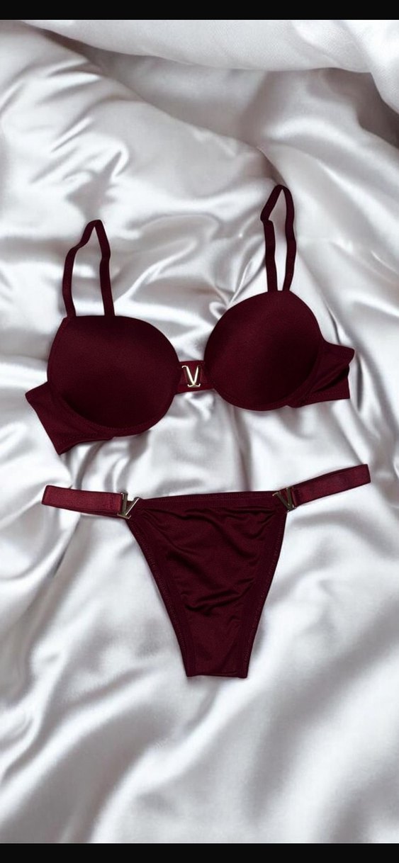 Bordo renkli, minimalist ve gotik tarzda sütyen ile uyumlu alt parçadan oluşan takım. Ayarlanabilir askılar ve metal detaylar içerir.
