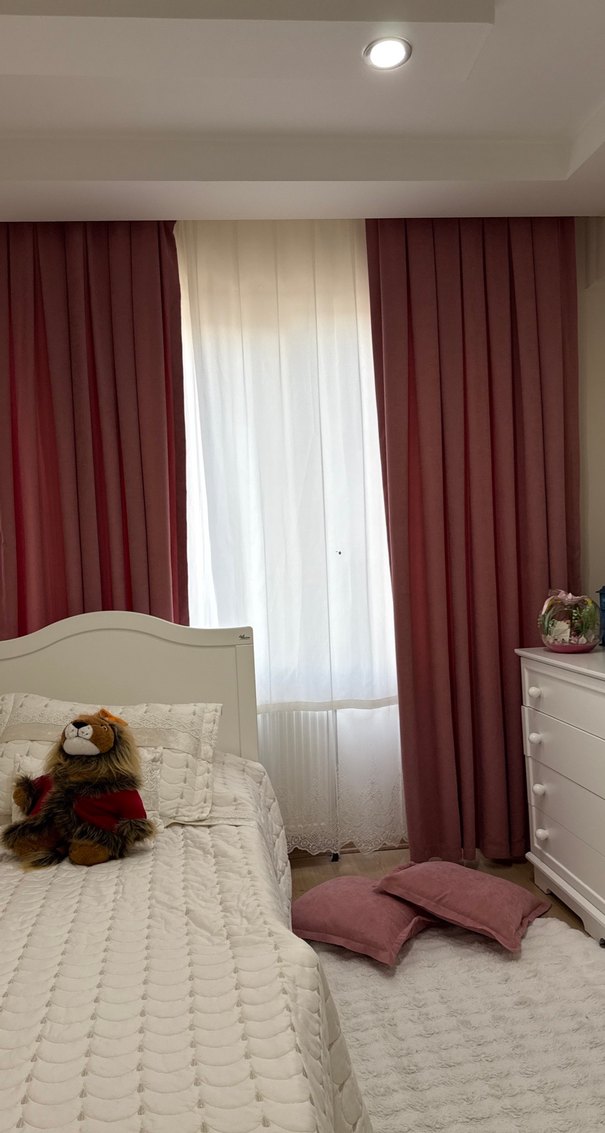Hafif koyu pembe renkli, bağlama desenli modern klasik stile sahip perdeler odaya zarif bir dokunuş katıyor.2 adet oturma minderi de dahildir.