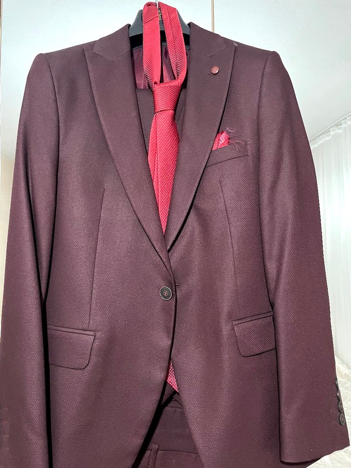 Concort Bordo renkli takım elbise beden:48, düğmeli ve çatallı yakalı erkek takımı. Normal boy, regular fit ve desen içermeyen modern klasik tarzda, ofis kullanımı için uygun.