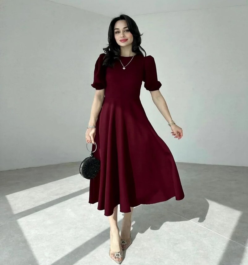 Bordo uzun elbise, kısa kollu ve yuvarlak yakalı, bol kesimdir. İpeksi kumaştan yapılmış, günlük kullanım için sade ve modern klasik tarzda, zahmetsiz şıklık sunar.