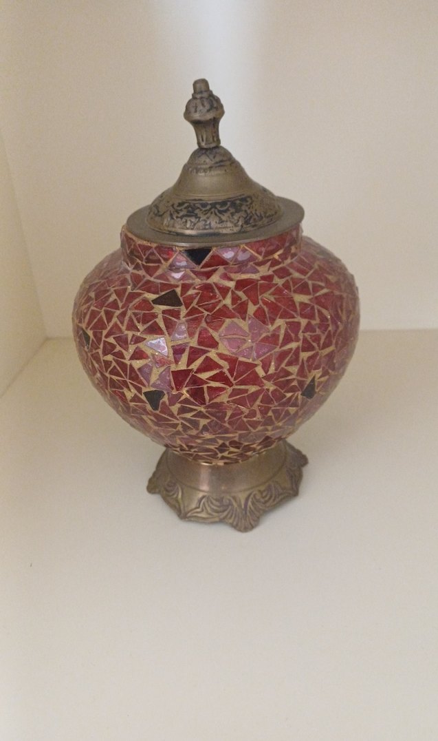 Bordo mozaik desenli, dekoratif metal kapak ve tabanı olan renkli vazo. Her mekâna sanatsal bir dokunuş katar.