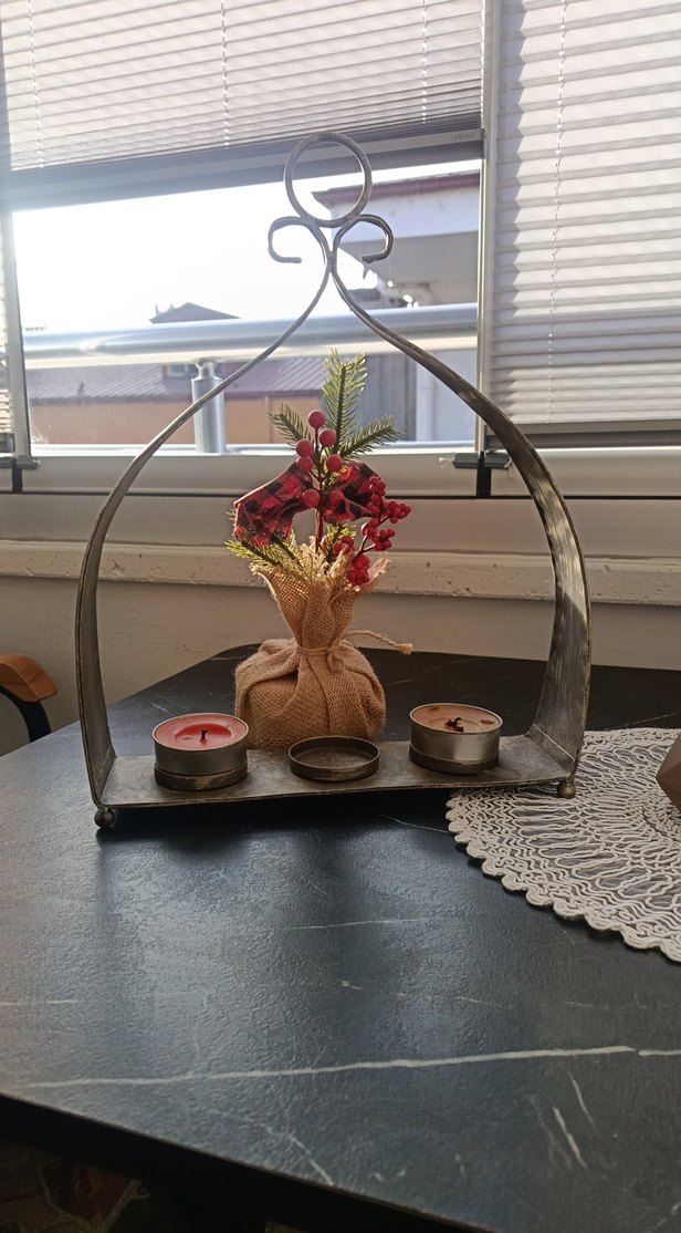 İki bordo tealight mum ve ortasında dekoratif jüt kaplı bitki bulunan koyu renk metal mumluk seti. Üstte halka tutacaklı kavisli çerçeveye sahiptir. ️