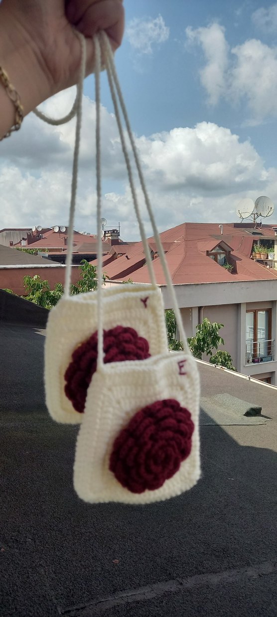 Bordo nakışlı çiçek desenine sahip, krem renginde yumuşak örme dokulu bebek çantası, uzun askılıdır.