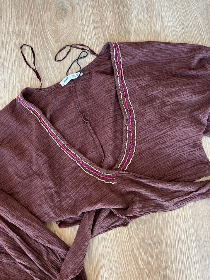 Bordo renginde, bohem tarzda, yumuşak dokulu kumaştan, nakış detaylı ve belden bağlamalı bir bornozdur.