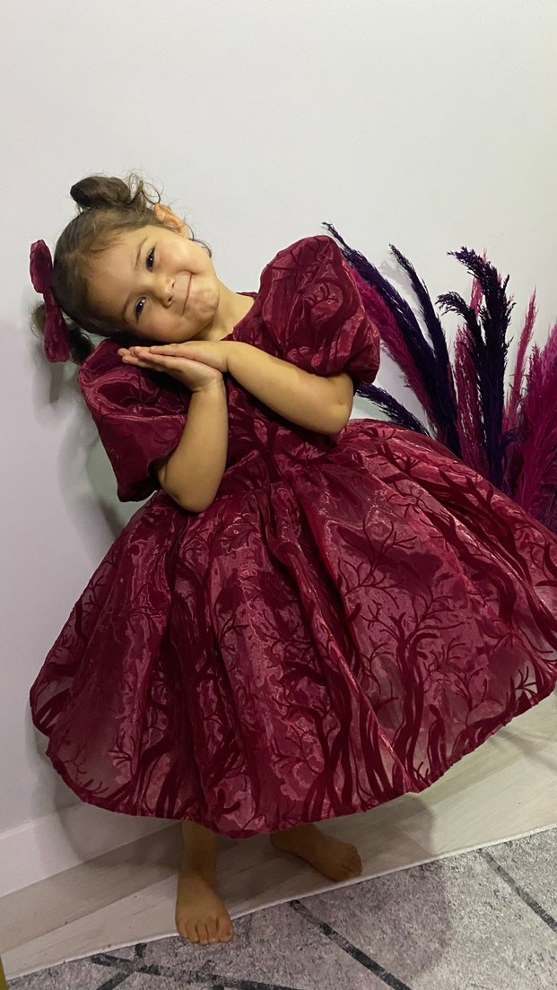 Sentetik kumaştan yapılmış, bordo renkli, nakışlı ve drapeli, straplez, bol kesim çocuk abiye elbisesi.