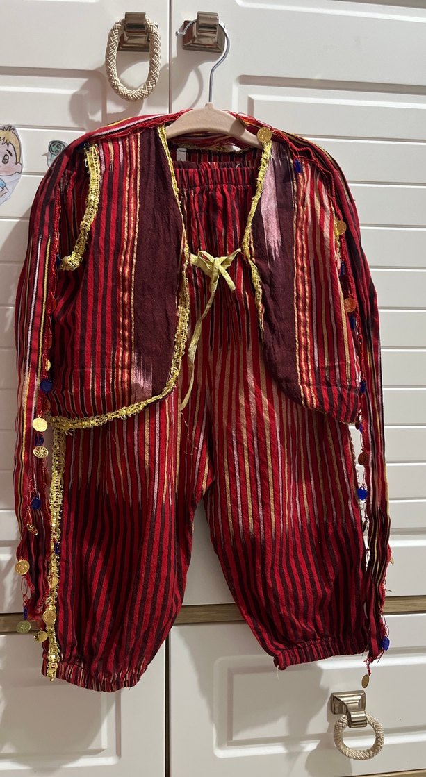 Bordo renkli, bol kesim çocuk kostümü, pileli ve nakışlı detaylara sahip. Askılı ceket, yakası kesik ve bohem tarzda süslemelerle tamamlanmıştır. 3-4 yaşa uygun hiç giyilmedi.