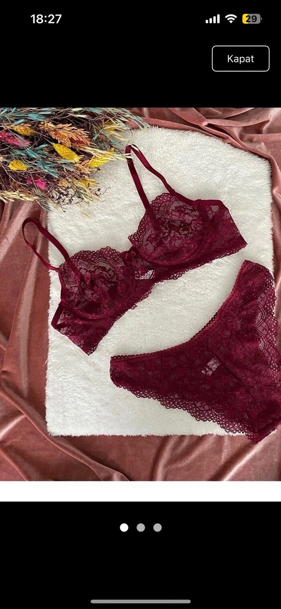 Bordo renkte, nakışlı dantelden yapılmış bohem tarzı sütyen ve normal boyda külot takımı, rahat ve şık bir görünüm sunar.