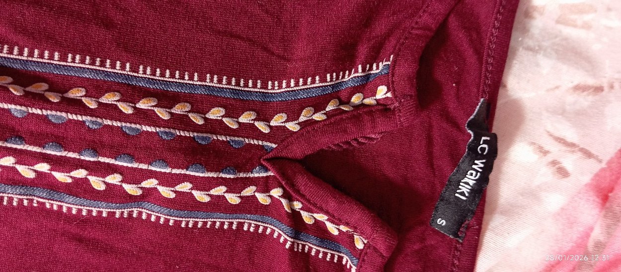 Bordo renkli, nakışlı hamile tuniği. V yakalı, uzun kollu, düğmeli ve bol kesimdir. Bohem tarzda, midi boyda, günlük kullanım için uygundur.