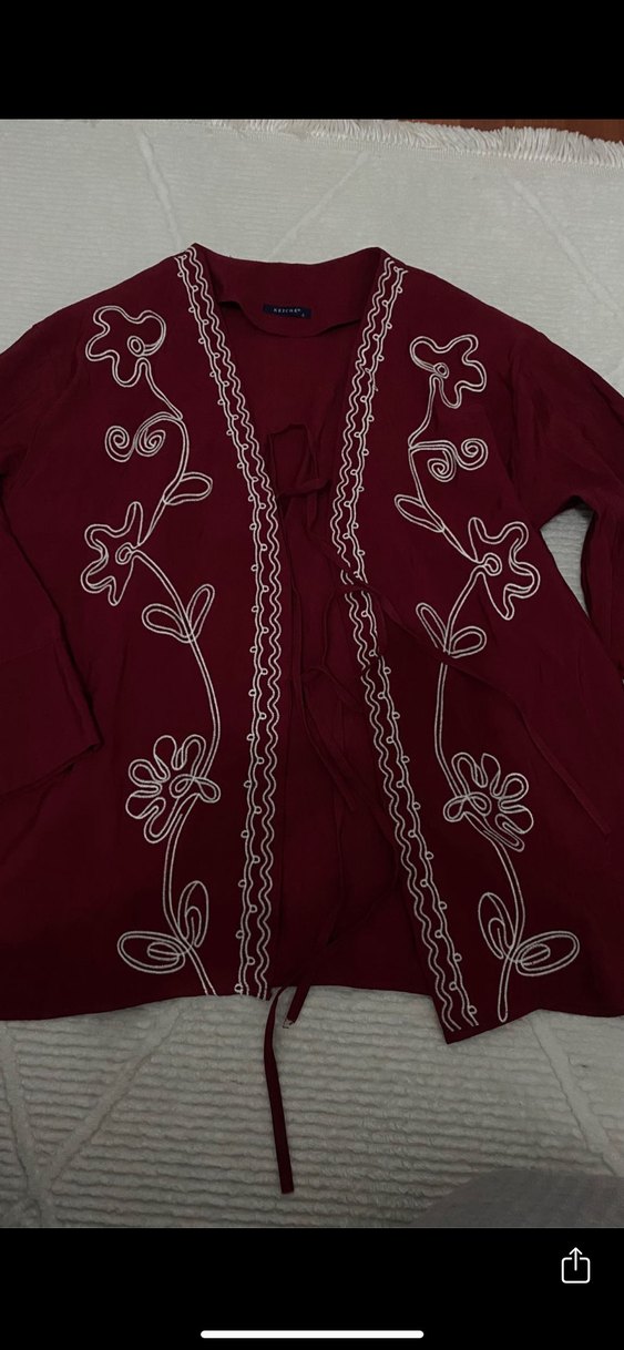 Bordo, uzun kollu, nakışlı çiçek desenli, düğmeli, notalı yaka detaylı bohem tarzda kadın ceketi. Rahat kesim.