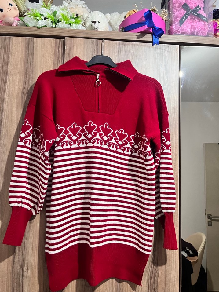 Bordo renkli,balon kol, yüksek yakalı ve fermuarlı, uzun kollu, bol kesim örgü kazak. Renkli nakış ve çizgili detaylarla bohem sokak stili için uygundur. 40-42 beden uyumlu