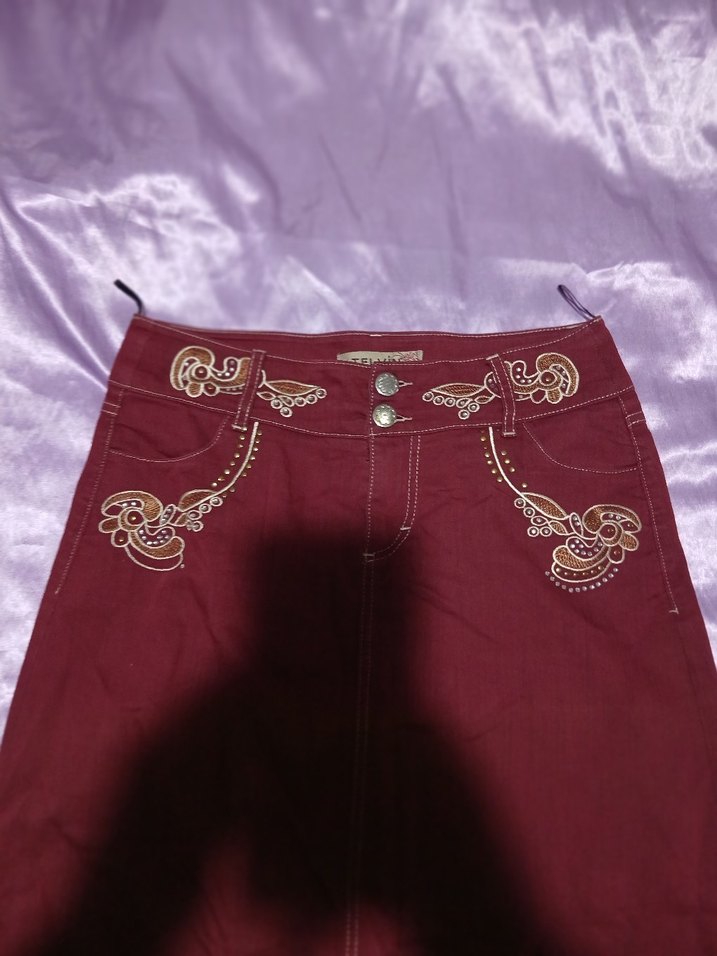 Bordo, nakışlı detaylara ve düğmeli kapamaya sahip, uzun etek #etek #bayangiyim