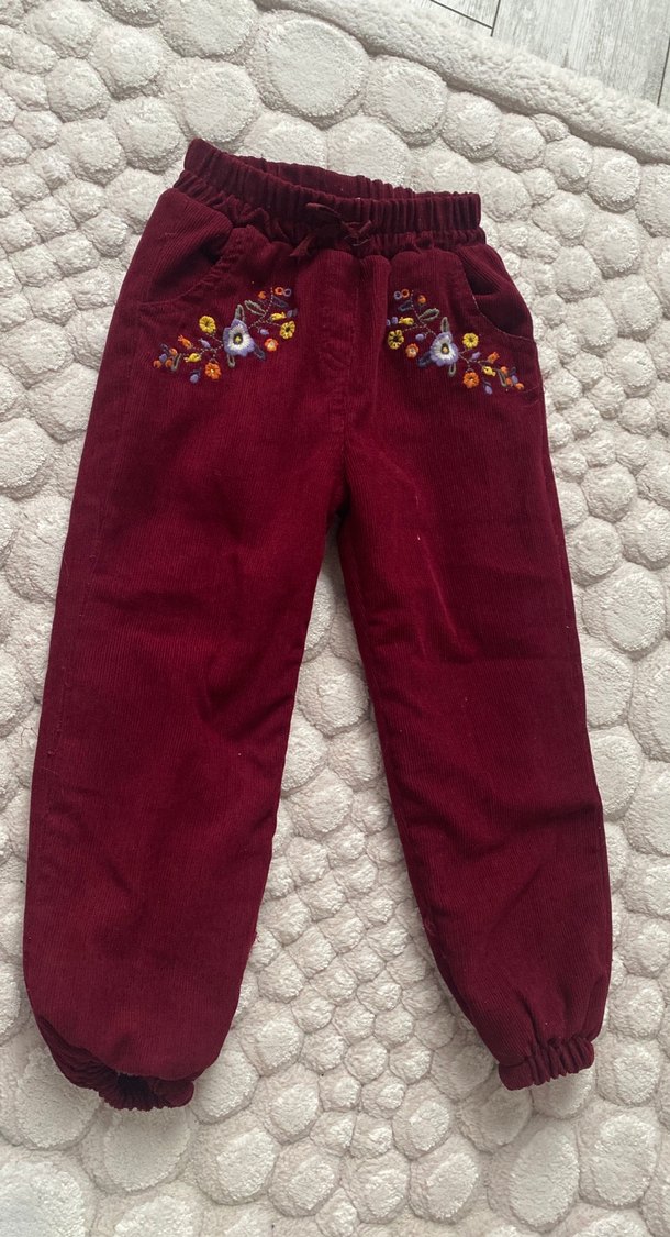 Bordo, bol kesim kız pantolonu, renkli nakış detayları ve düğmeli tasarıma sahip. Yumuşak ve sıcak kumaş, lastikli bilek ve bel kısmı ile. 4-5 yaşa daha uygundur.çok az giyildi.