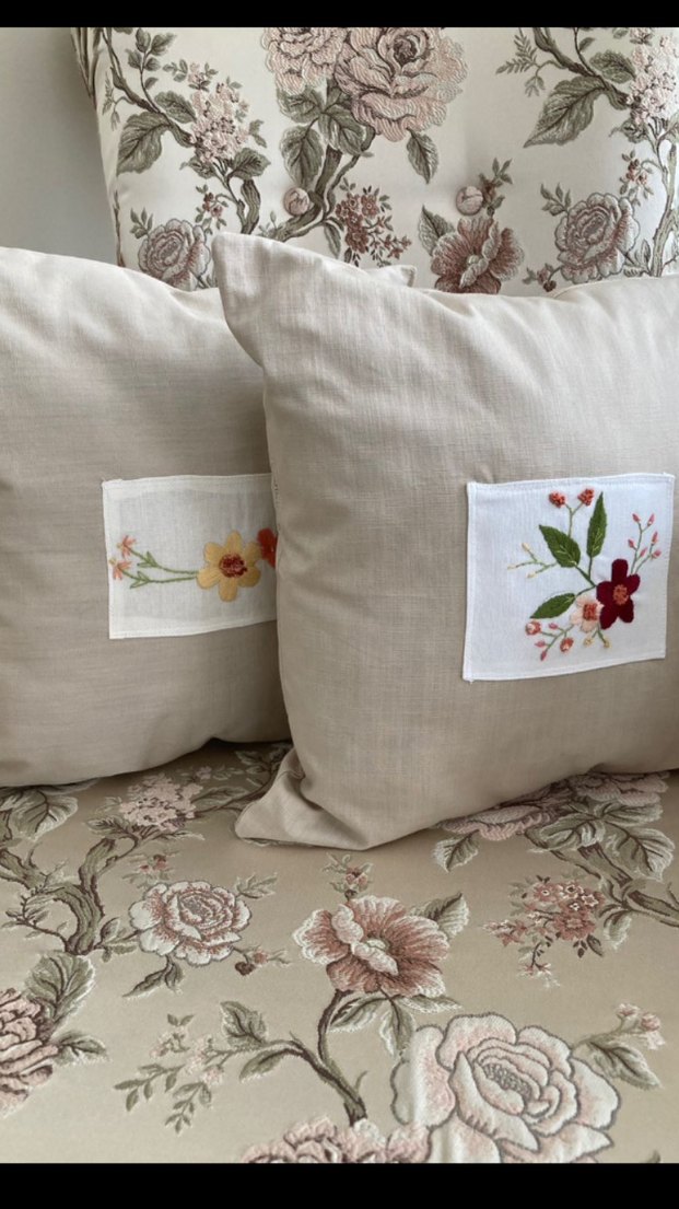 Yumuşak kumaş üzerine nakışlı çiçek desenli, açık bordo renkli bohem tarzı kırlent kılıfları. Dolguludur