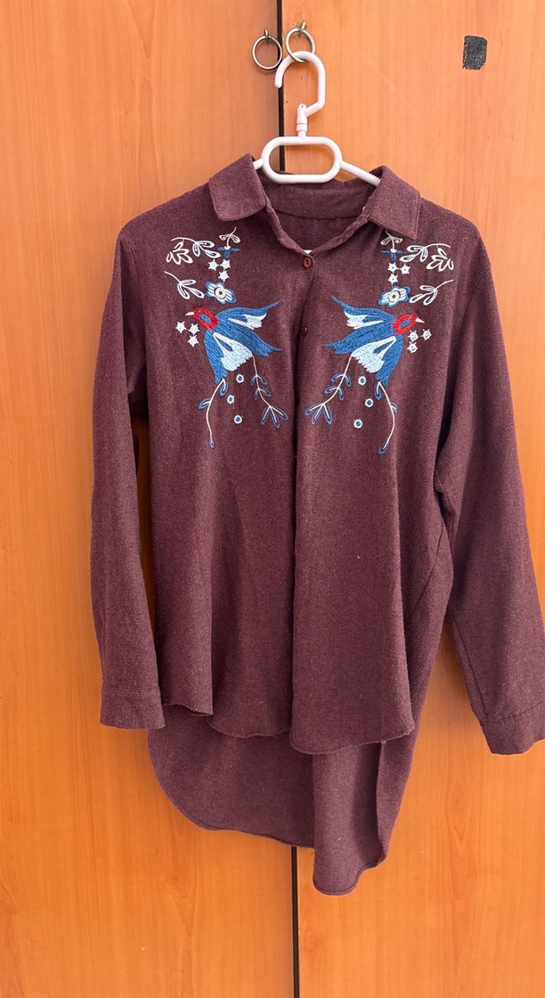 Bordo renkli, yakalı uzun kollu gömlek, mavi kuş nakışlarıyla süslenmiş. Örgü dokulu, bol kesim ve rahat bir yapıya sahip. Günlük kullanıma uygun. ️