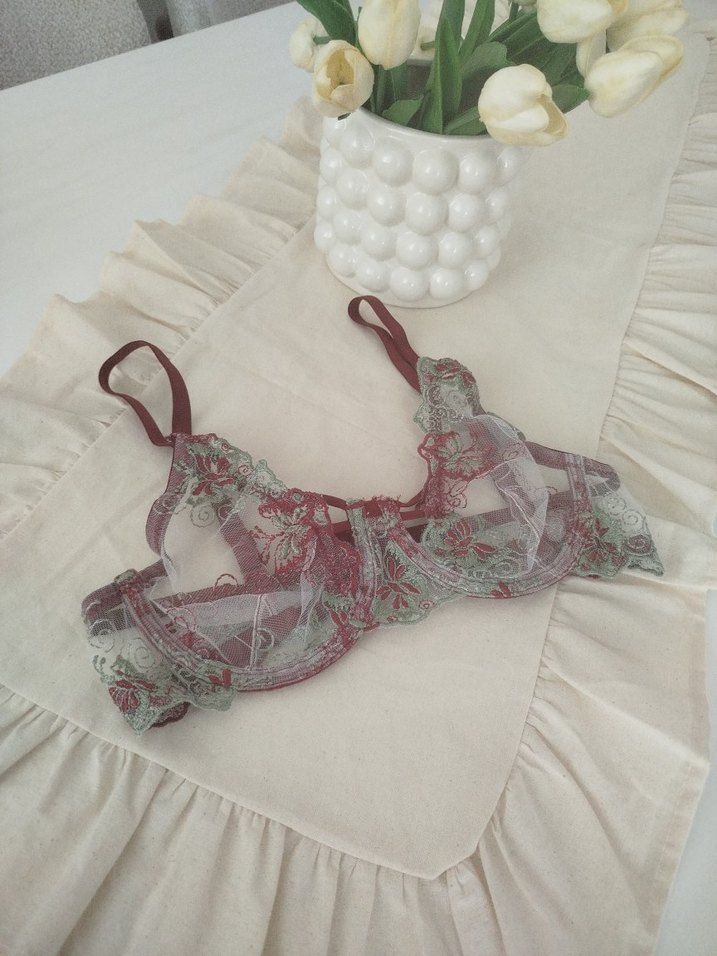 Bordo renkte, nakış detaylı, bohem ve vintage tarzda sütyen. Normal uzunlukta ve pastel tonlarda, şık ve hafif bir his sunar. 75 b
