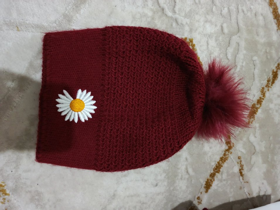 Bordo renginde, örgü çocuk beresi, renkli nakışlı papatya detayı ve yumuşak ponpon ile bohem tarzı için uygun.