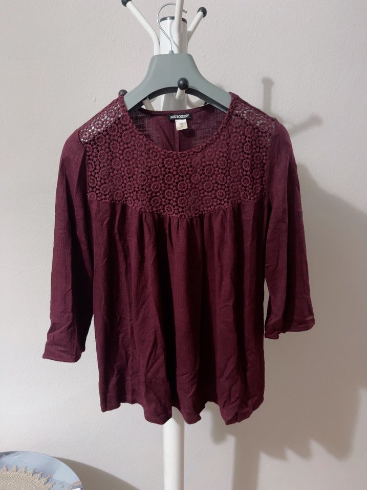 Bordo renkte, uzun kollu, bol kesim, yuvarlak yakalı bluz. Nakışlı triko ve dantel detaylarıyla bohem tarzda, günlük kullanıma uygun.