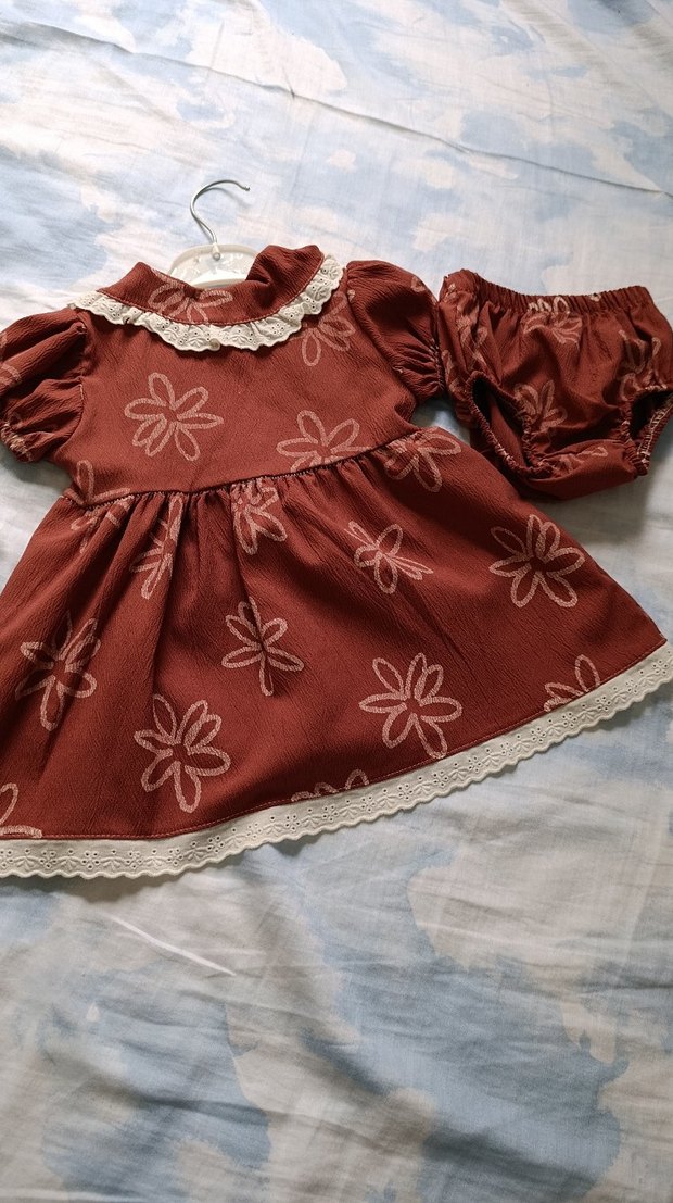 Bordo nakışlı çiçek desenleri ve dantel detaylı kız elbisesi. Uzun kollu, bol kesim ve uyumlu külot ile birlikte.