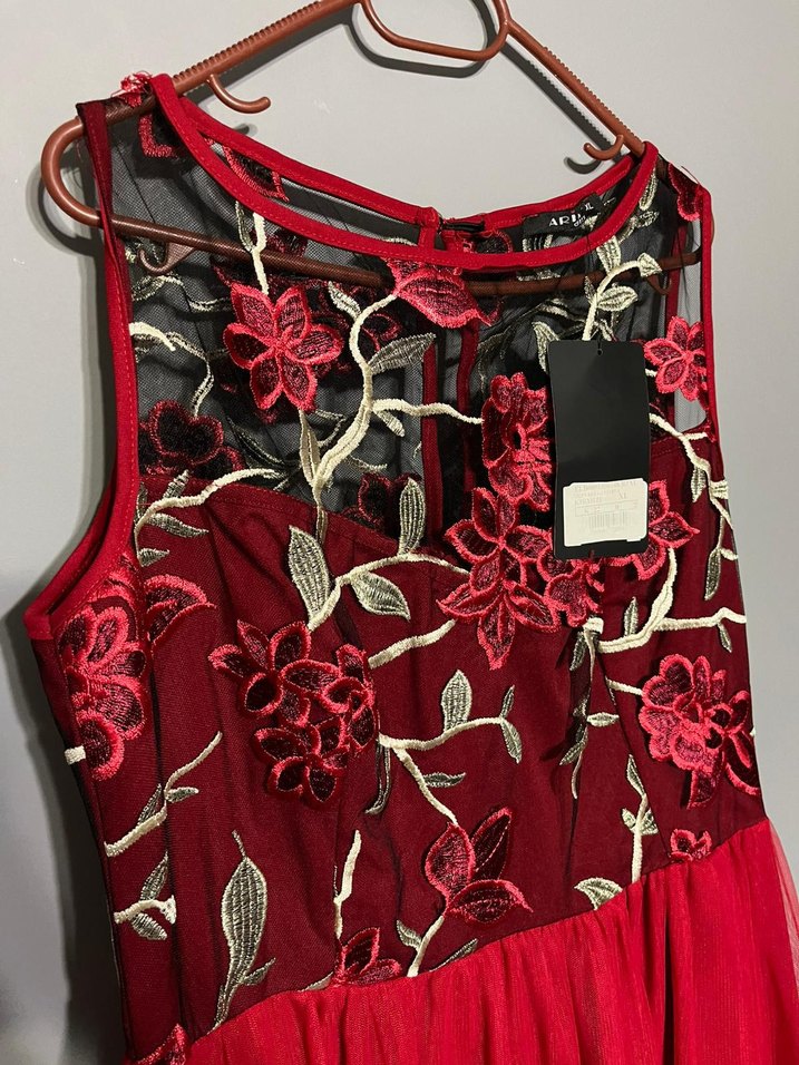 Bordo renkli, nakışlı ve dantel detaylı, straplez yaka ve kolsuz uzun abiye elbise. Vintage bohem tarzıyla romantik akşamlar için ideal.