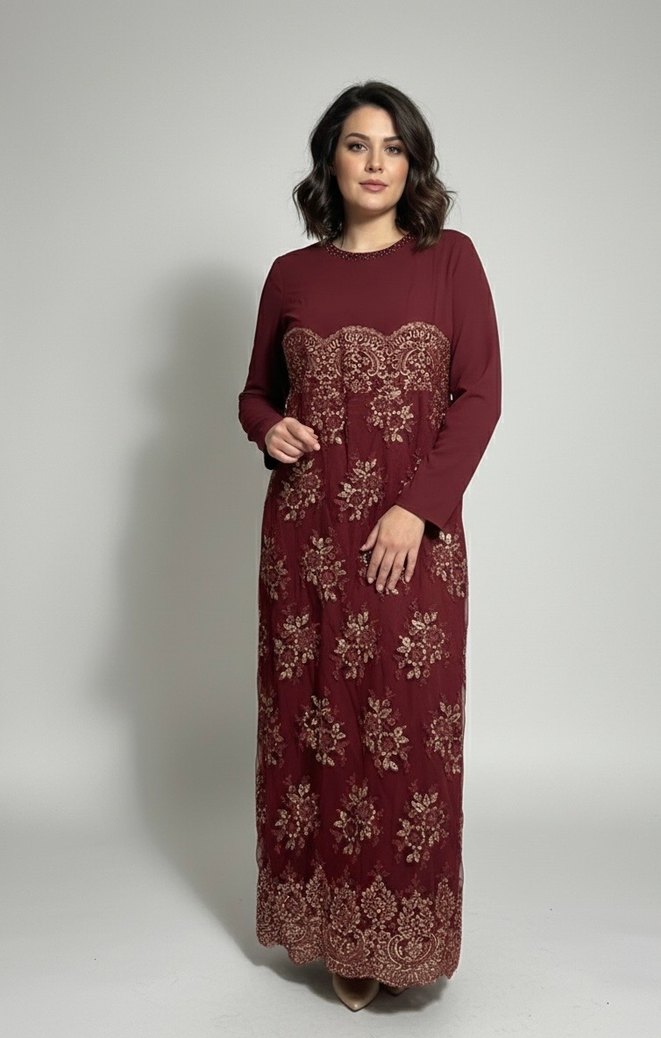 Bordo renkte, uzun kollu ve kayık yaka, nakışlı dantel detaylarıyla süslenmiş, bol kesimli ve modest tarzda uzun elbise.