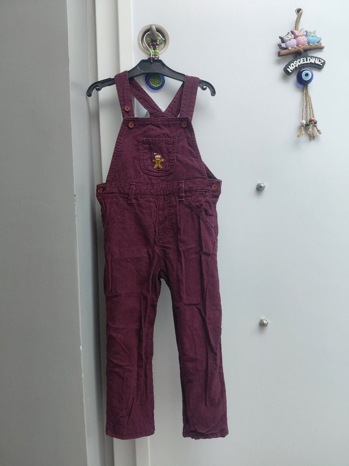 Bordo renkli, nakış detaylı erkek çocuk tulumu, askılı ve tokalıdır. Rahat kesimi ve tekstil kumaşıyla sokak stiline uygundur. 3 /4yaş