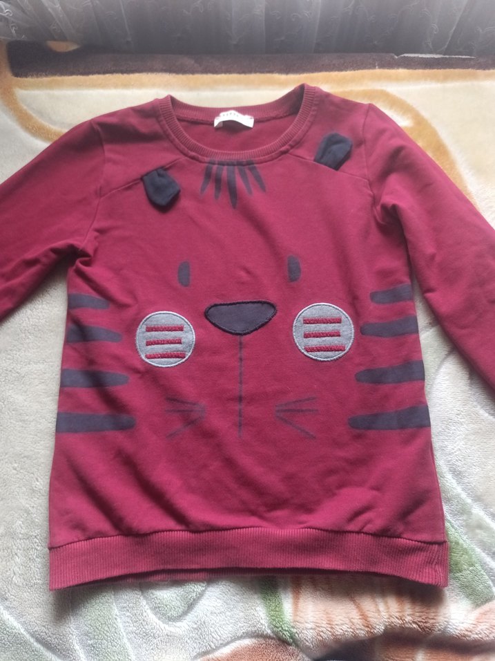 Bordo renkli, uzun kollu ve bisiklet yaka erkek sweatshirtü, renkli kaplan yüzü baskısı ve örgü detayları ile salaş kesime sahiptir. iki iplik