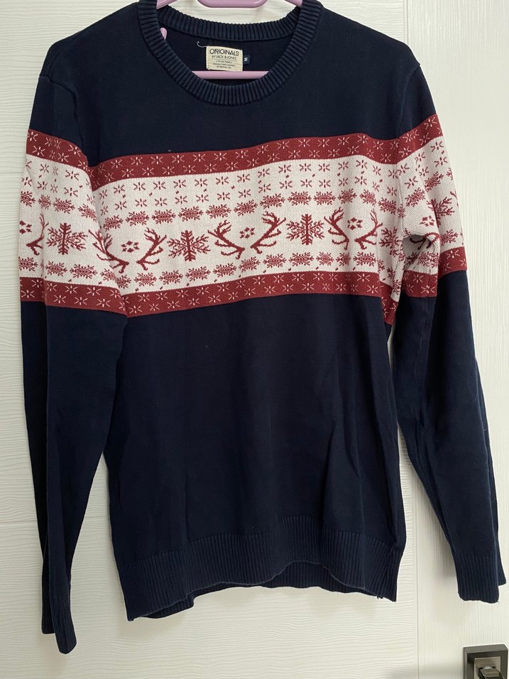 Uzun kollu, yuvarlak yaka ve bordo renginde nakış detaylı, triko kumaştan erkek kazak. Günlük sokak stiline uygun rahat kesim.