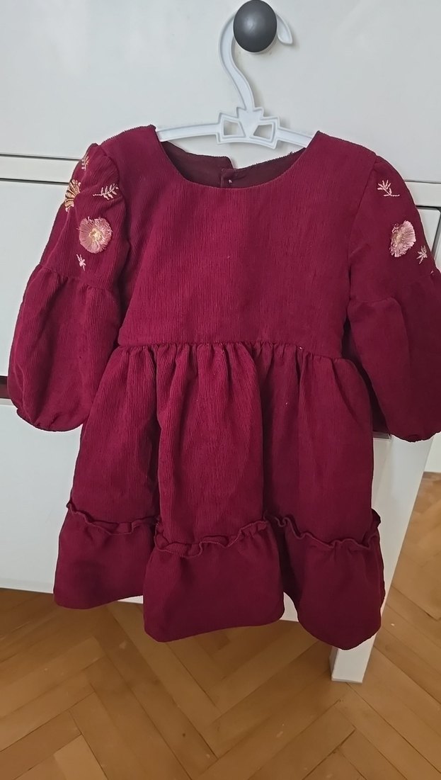 Bordo renkli, uzun kollu, nakışlı ve fırfırlı detaylara sahip kız çocuk elbisesi. Rahat kesim ve yuvarlak yakalı, yumuşak ve sıcak kumaştan yapılmıştır.