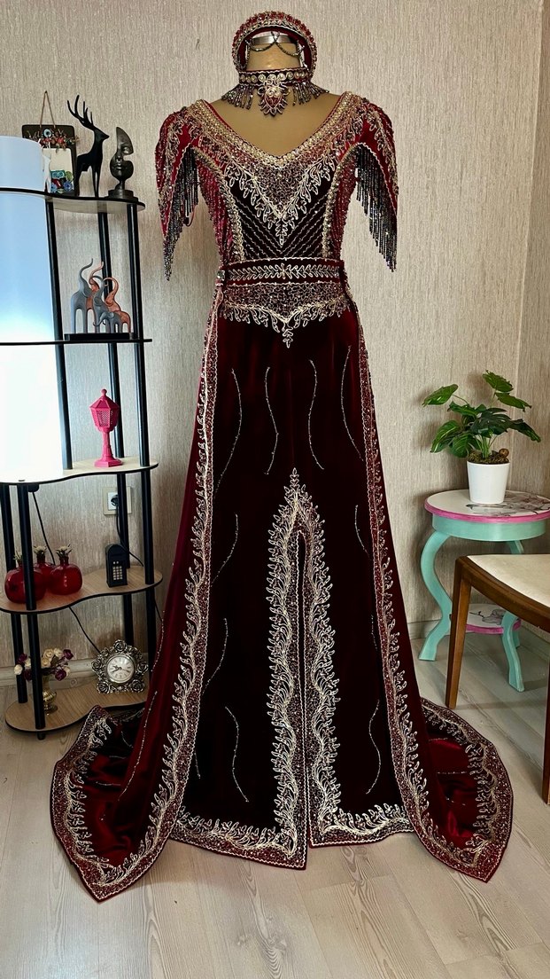 Bordo renkli, kısa kollu, V yakalı kadın bindallısıdır. Nakışlı ve drapeli detaylarla süslenmiş, bol kesimdir. Düğün ve gotik tarz için uygundur.