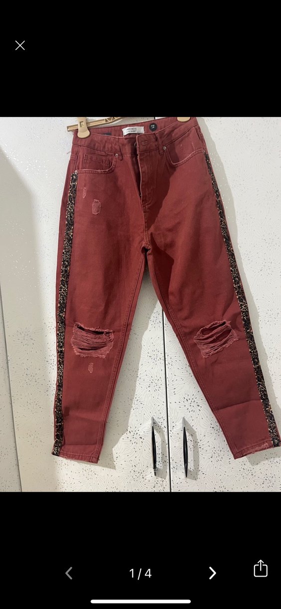 Kiremit renkli, nakışlı detaylara sahip, kemerli ve mom kesim kot pantolon, günlük sokak stili için uygun.