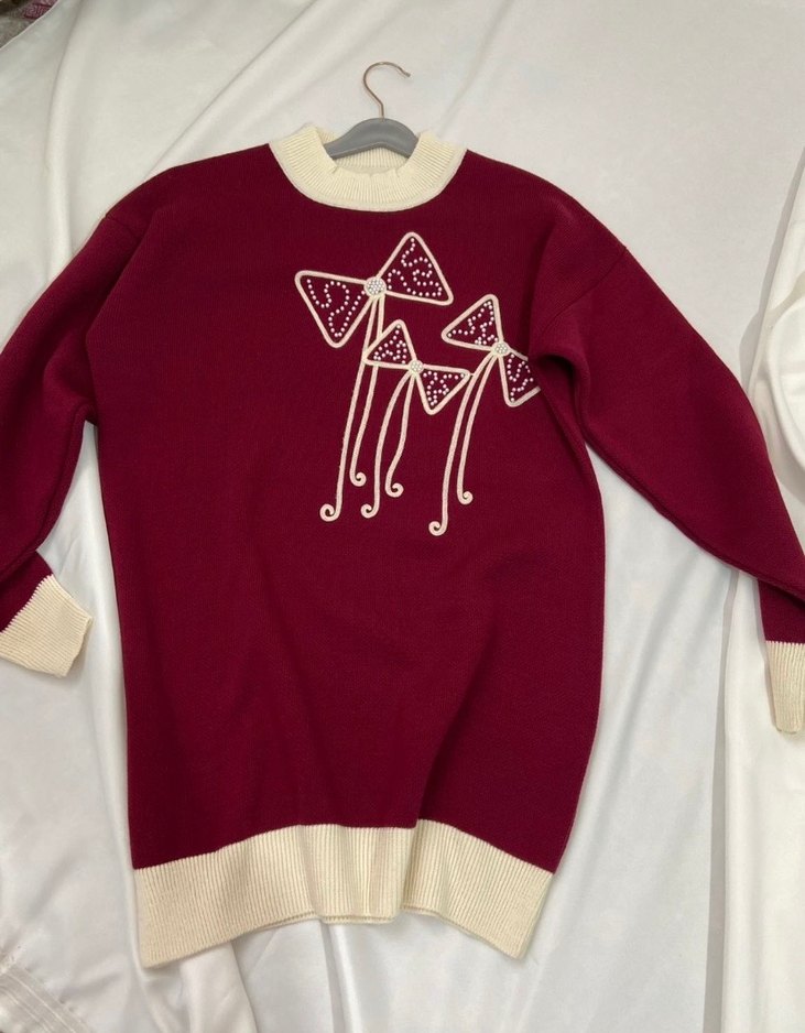 Bordo renkli, nakışlı fiyonk detaylı, yuvarlak yakalı ve uzun kollu triko kazak. Rahat kesim ve normal boyda, krem renkli ribana detaylara sahip.