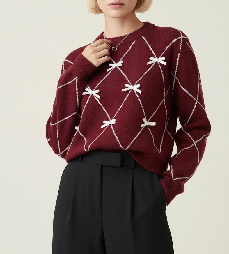 Bordo renkte, yuvarlak yaka ve uzun kollu, nakışlı fiyonk desenleriyle süslenmiş, normal boy ve rahat kesim triko kazak.