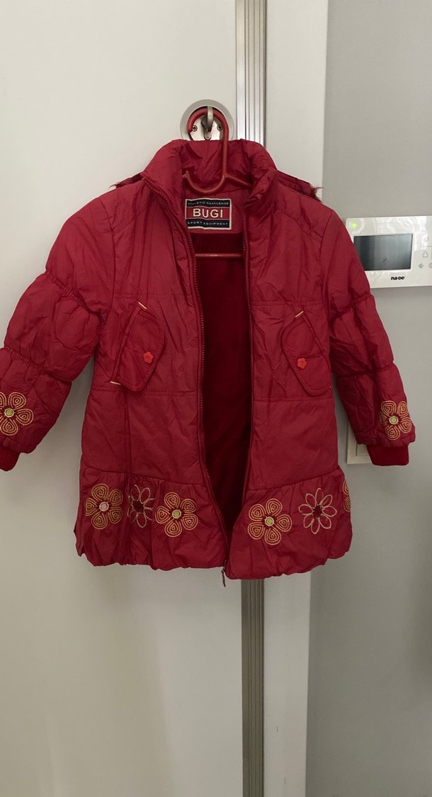 Bordo, nakışlı çiçek detaylı kız çocuk montu. Düğmeli kapama ve notlu yaka ile rahat, yumuşak kumaştan üretilmiştir. Marka: BUGI.