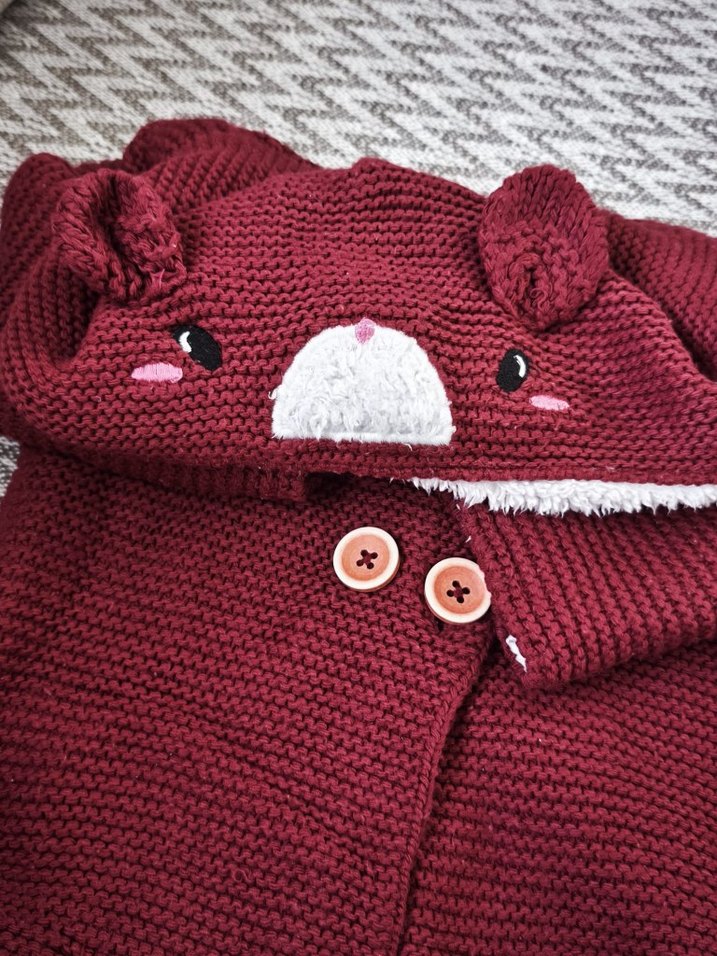 Bordo renkli, uzun kollu, nakış detaylı ve bohem tarzda kız çocuk triko hırkadır. Kapüşonunda sevimli hayvan yüzü ve ahşap düğmeler bulunur.