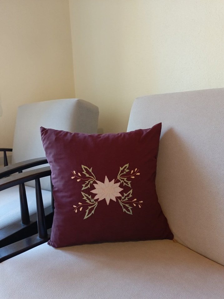 Bordo renkte, klasik tarzda ve nakışlı desenli koyu renkli dekoratif yastık.