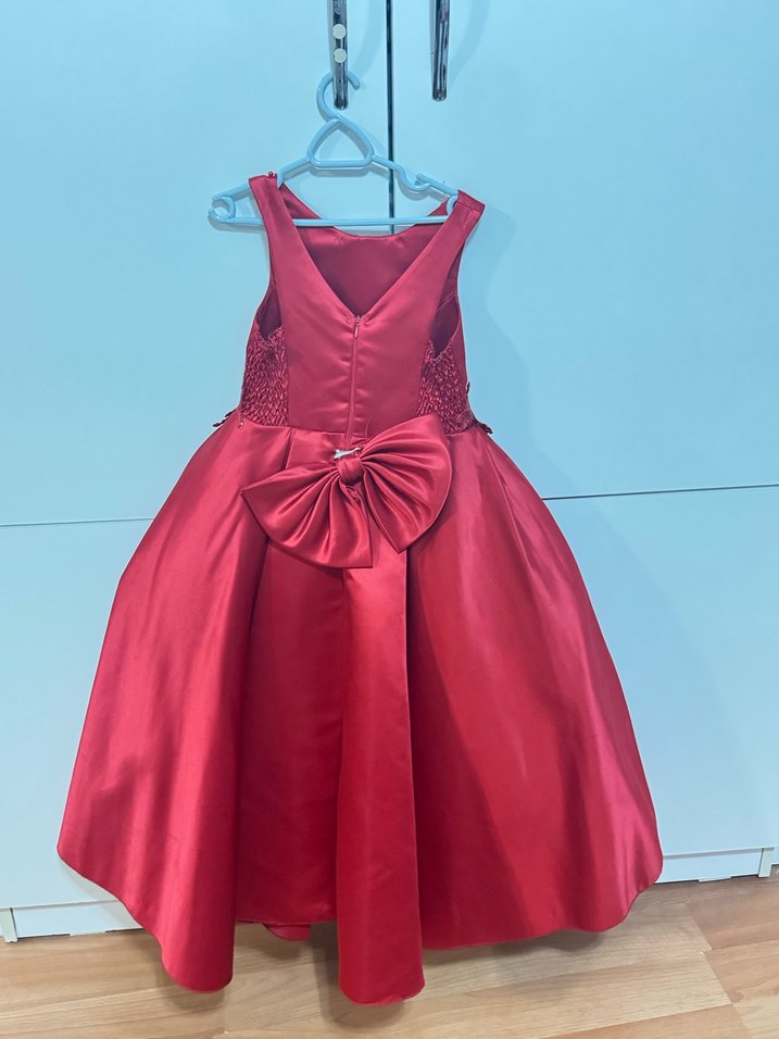 V yaka ve kolsuz, bordo renkli, nakış detaylı, belde parlak fiyonk bulunan klasik kesim kız çocuk abiye elbise