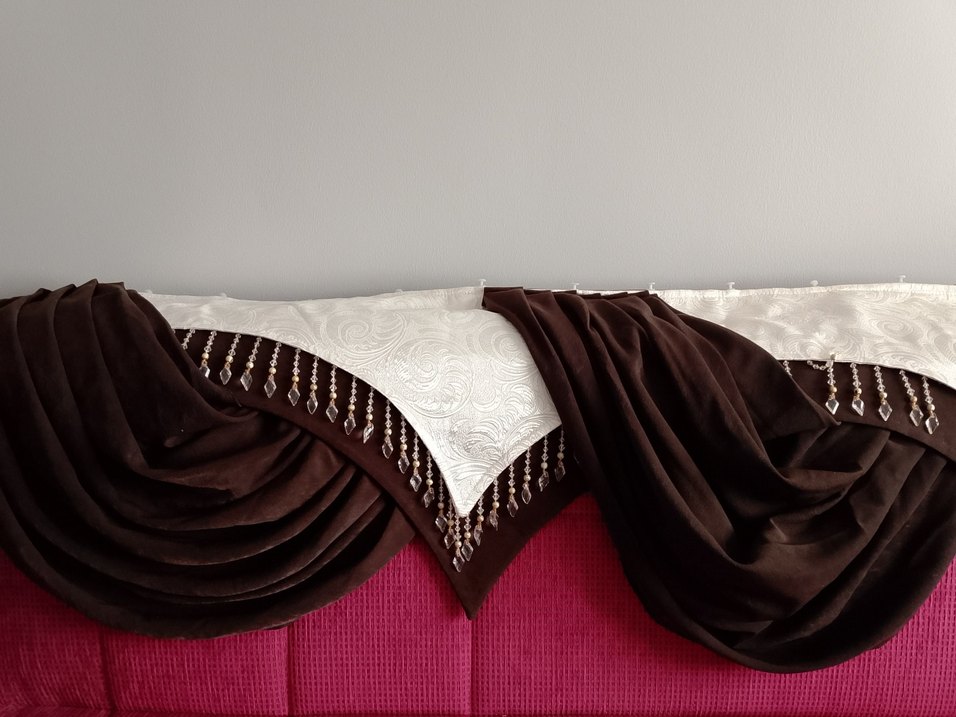 Bordo renkli, nakışlı detaylar ve boncuklu püskül süslemeleriyle klasik tarzda perde.