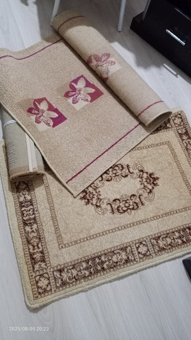 Hafif bordo renkli, nakışlı çiçek desenleri ve klasik bordürleriyle zarif halılar. #Paspas #Yolluk . Yıkandı temiz. Üç adet. Biri küçük diğerleri daha büyük 80-90 cm, 1 m10 cm civarı
