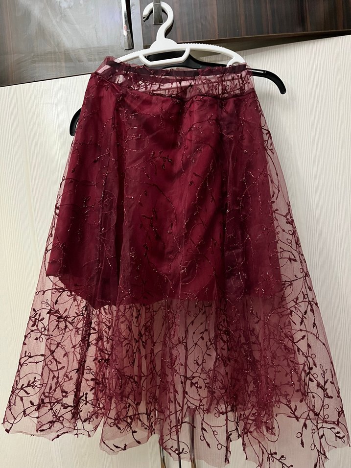 Bordo renkli, nakışlı ve drapeli sentetik kumaştan midi uzunlukta, bol kesim etek. Gotik düğünler için uygun.