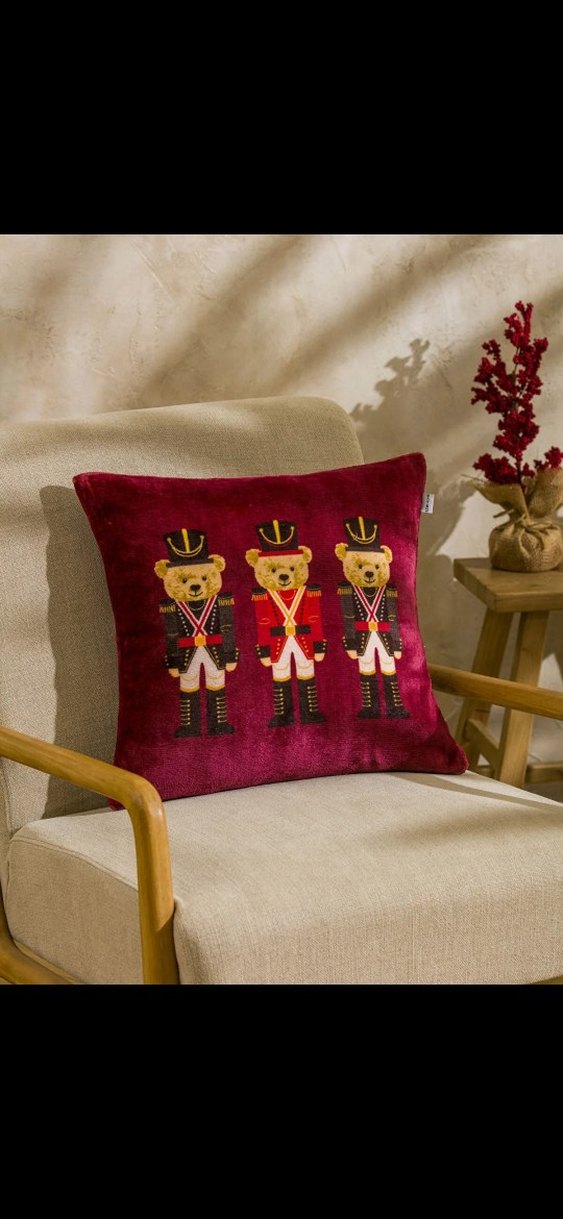 Bordo renkte, üç oyuncak asker ayı nakışlı, modern klasik tarzda minder kılıfı. Lcw home sıfır etiketli üründür.