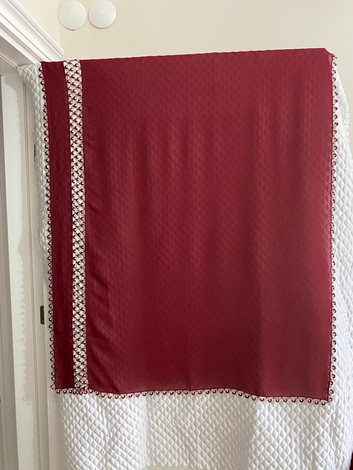 Bordo renkli, parlak kumaşa sahip, kenarları nakışlı namaz örtüsü . Uzunluğu 142, eni 80 cm , hiç bir sorunu yoktur inci ile örülmüş tığ oyası