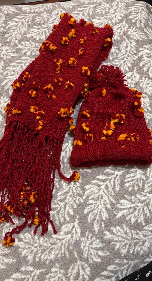 Bordo renkli örgü bere ve atkı seti, renkli nakış detayları ve püsküllerle bohem tarzını yansıtıyor.