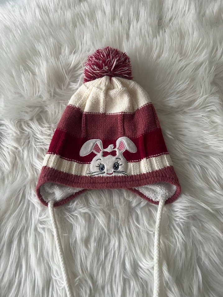 Renkli örgü çocuk beresi, bordo ve krem çizgilerle, üstünde ponpon ve nakışlı tavşan figürü bulunur. Kulak korumalı ve bağcıklıdır.