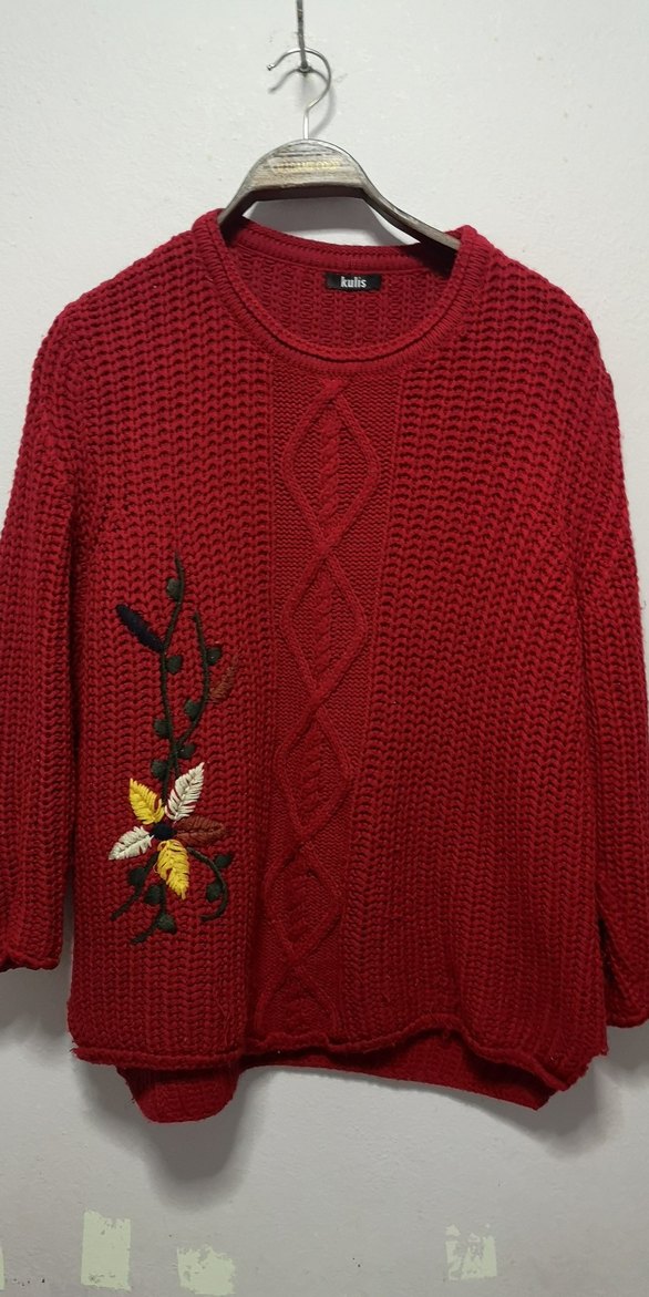 Bordo renkli, uzun kollu, yuvarlak yaka, nakışlı çiçek desenli örgü kadın kazak. Bol kesim ve kısa boyda, bohem tarzda bir tasarım. Boyu 71cm iki kol arası 64cm 44 beden