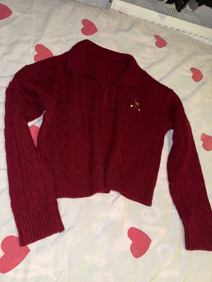 Bordo renkli, nakışlı ve örgü dokulu kadın kazak. Uzun kollu, yakalı ve midi boyda, günlük rahat kullanıma uygun.