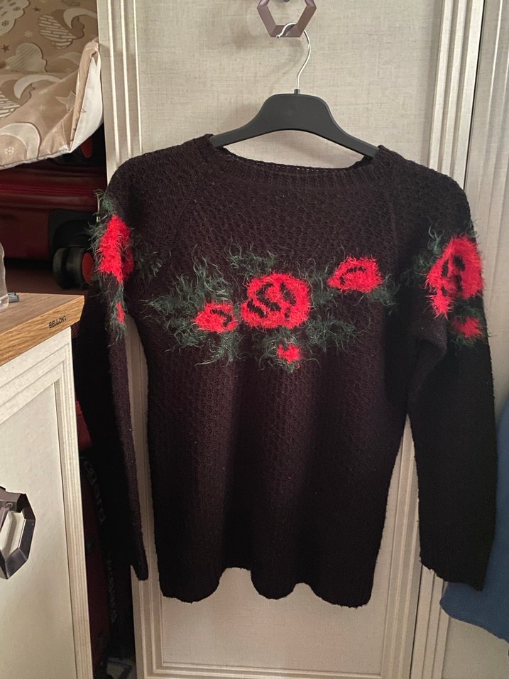 Siyah renkte, uzun kollu ve bisiklet yaka örgü kazak. Ön ve kollarda kırmızı nakışlı çiçek desenleri bulunur. Rahat kesimli, bohem tarzda, günlük kullanıma uygun. Mevsimlik denilebilecek kazak çok kalın değil çok rahattır renk atması yok fotoğraf ışığından kaynaklı