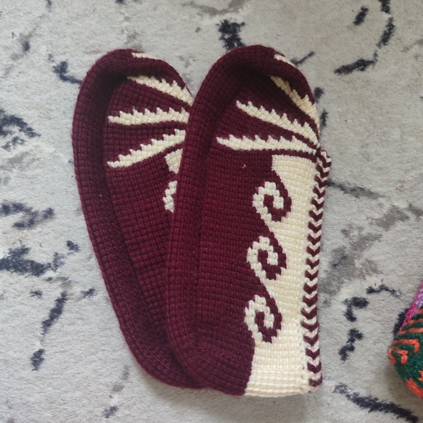 El emeğidir. Bordo renkli, nakışlı desenlere sahip, örgü dokulu ve kama topuklu kadın terlikleri, bohem ve rahat tarzı günlük kullanım için sunar.
