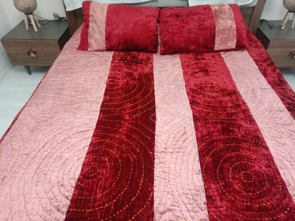 Bu yatak örtüsü, parlak bordo ve pembe tonlarda nakışlı desenlere sahip olup yatak takımınıza doku ve zarafet katar. Uyumu sağlayan yastık kılıfları dahildir. ️