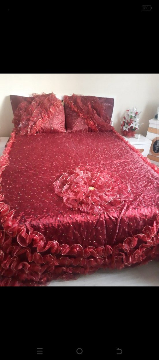 Nakışlı detaylara ve fırfırlı kenarlara sahip parlak bordo yatak örtüsü, uyumlu yastık kılıflarıyla tamamlanmıştır.