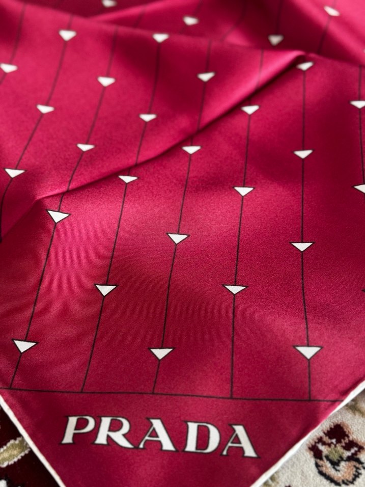 Bordo renkli, parlak dokulu Prada ithal eşarp nakışlı geometrik desenlere ve çağdaş bir tasarıma sahiptir. ✨